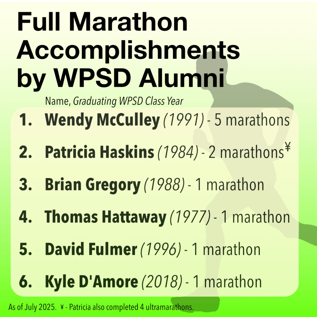 Kyle’s journey places him in a unique league—he is the sixth WPSD alumnus to complete a full marathon, an extraordinary accomplishment within the WPSD community. His story reflects not only personal dedication but also the growing popularity and impact of long-distance running across the United States.